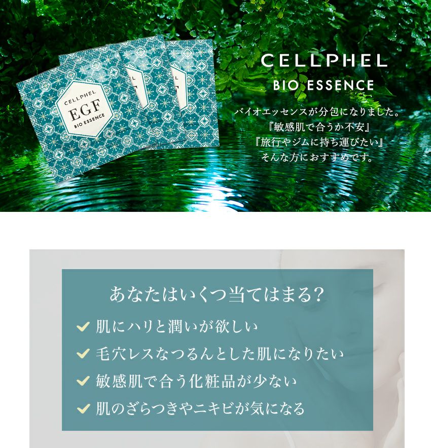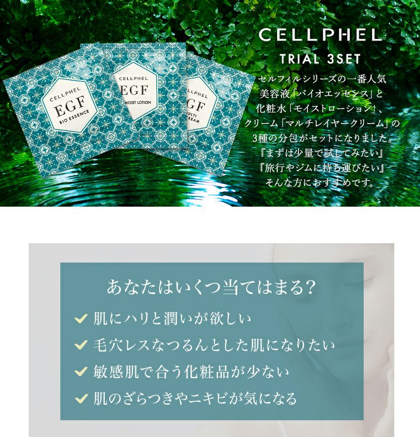 他の画像を見る EGF化粧品 CELLPHEL COSMETICS会員ポイント10~25倍 『セルフィル トライアルセット』バイオエッセンス10包 + モイストローション10包 + マルチレイヤークリーム7包 + フェイスマスク3包 / 価格 ¥ 3,500 税込 詳細を見る お気に入りに登録する