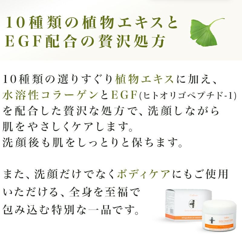 他の画像を見る 10種類の植物エキスと、コラーゲン EGFを配合した贅沢洗顔 EGF配合『セルソアン エクストラクリームソープPN 120g』 価格 ¥ 6,050 税込 カートに入れる お気に入りに登録する